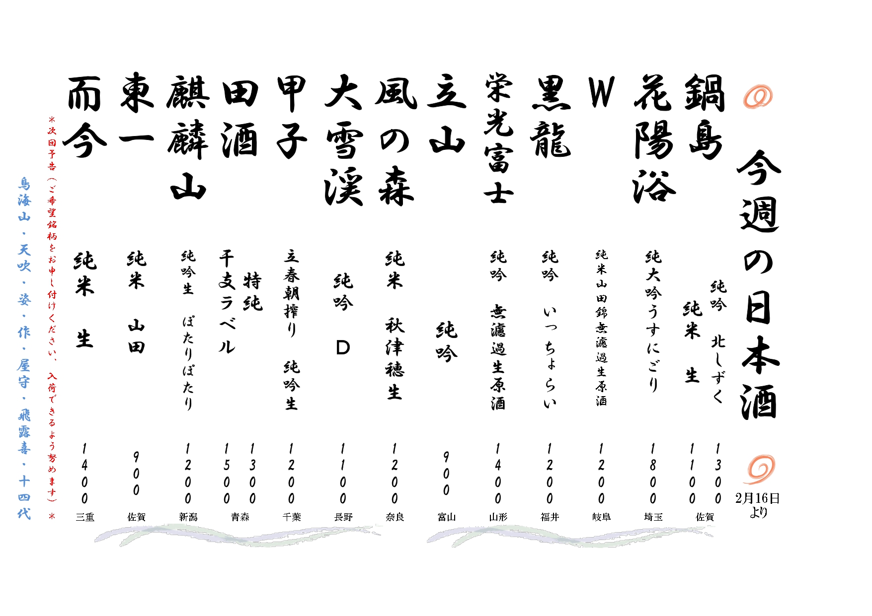 Stop! 20歳未満飲酒▪飲酒運転。お酒は楽しく適量で。妊娠中▪授乳期の飲酒はやめましょう。 ※表記は全て税抜き価格です。