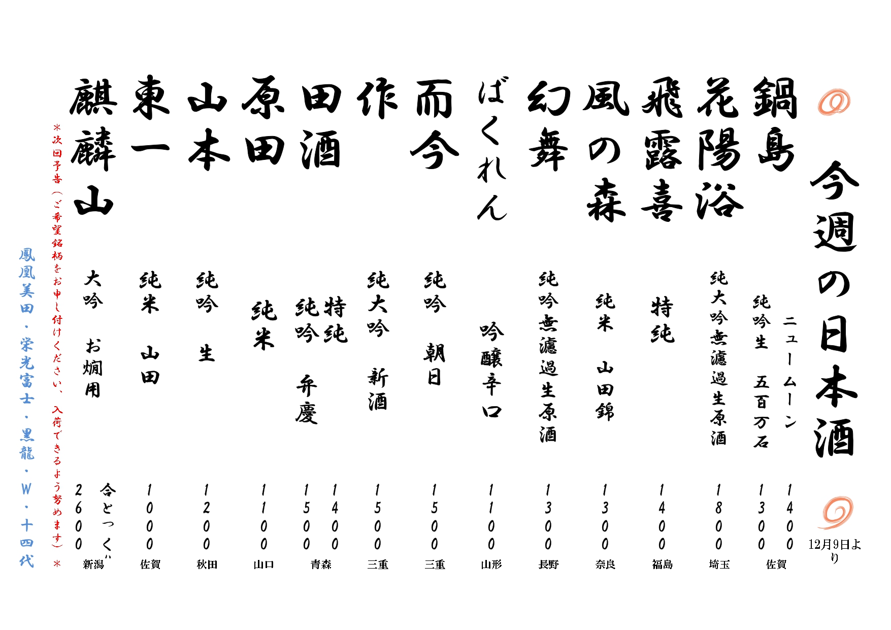 •鍋島 •田酒 •花陽浴 •屋守 •十四代 •飛露喜 •村裕 •而今 •仁王 •幻舞 •新政🈀 入荷中のお酒を概ね週変わりでご案内しておりのでお席のメニュー表からお選びください❗ ※画像はサンプルです。最新入荷のお酒は店内でご案内しております。